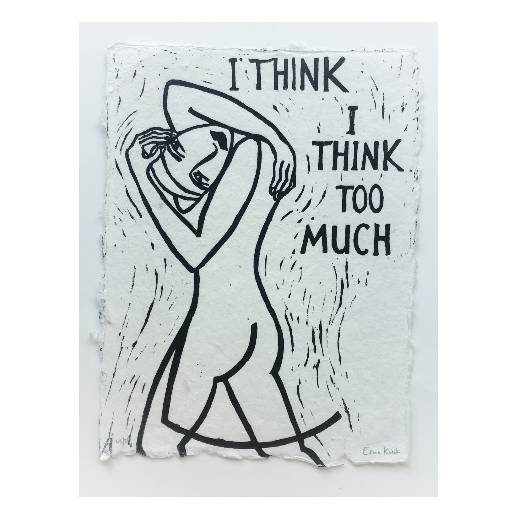 Thinking about thinking. Strong simple lines express the feeling about thinking. It’s the thinking about thinking which makes this print a very philosophical one. Linocut print on handmade mulberry paper.