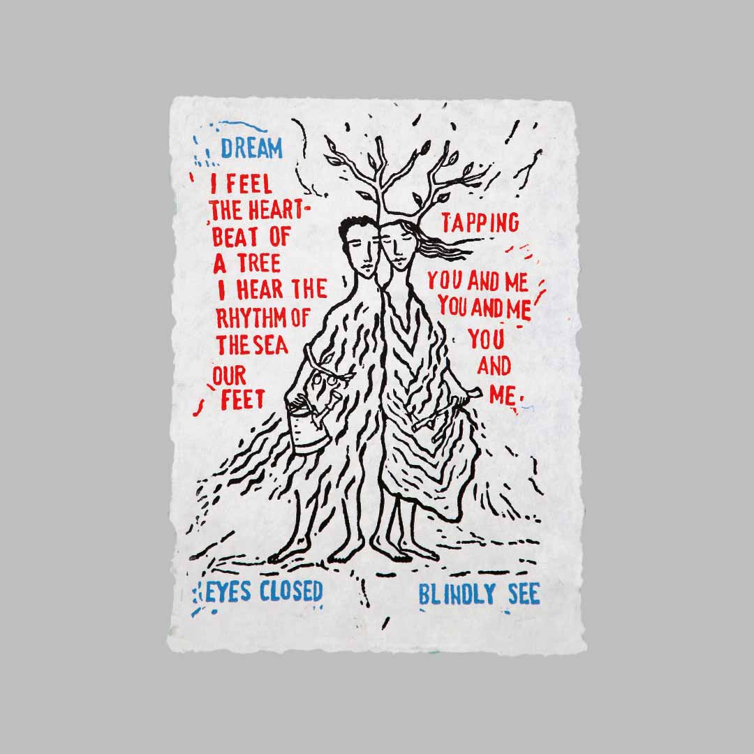The lovers, multicolored linoprint. Oilbased ink on mulberry paper.